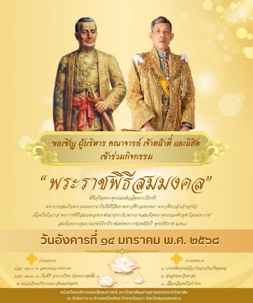 พิธีเจริญพระพุุทธมนต์เฉลิมพระเกียรติพระบาทสมเด็จพระปเมนทรามาธิบดีศรีสินทรมหาวชิราลงกรณฯ พระวชิรเกล้าเจ้าอยู่หัวเนื่องในโอกาสพระราชพิธีสมมงคลพระชนมายุเท่ากับพระบามสมเด็จพระพุทธยอดฟ้าจุฬาโลกมหาราช สมเด็จพระปฐมบรมกษัตริยาธิราชแห่งพระราชวงศ์จักรี พุทธศักราช 2568 🗓ในวันอังคารที่ ๑๔ มกราคม ๒๕๖๘ 📍 ณ หน่วยวิทยบริการคณะสังคมศาสตร์ มหาวิทยาลัยมหาจุฬาลงกรณราชวิทยาลัย ณ วัดอินทาราม ตำบลเหมืองใหม่ อำเภออัมพวา จังหวัดสมุทรสงคราม
